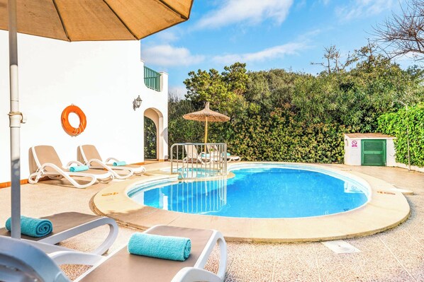 The villa has four bedrooms, two of which have ensuite facilities and a separate bathroom for the others to share. There is a fully fitted kitchen along with a living and dining area that leads directly out onto the covered terrace. Bedroom four is upstairs with a balcony overlooking the crystal-clear waters of your own private pool where many a happy hour can be spent splashing around with the little ones or relaxing on one of the comfortable sun loungers with this summer’s best-selling novel. Alongside the pool a brick barbecue has been provided, perfect for grilling up some burgers, or sampling the delicious local fish which can be purchased fresh from the fish market in Ciutadella, which is a short bus ride away.