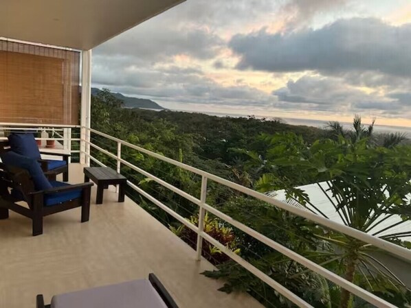 Discover a hilltop haven elevated above the jungle canopy, our modern 2-bedroom retreat delivers a breathtaking 95-degree panorama of the Pacific and Cabo Blanco Reserve. Relax on your private balcony to witness legendary Santa Teresa sunsets while the surrounding forest comes alive with monkeys and tropical birds. Just a 5-minute walk to the beach near La Lora surf break, restaurants, yoga studios, shops, and pool access all in one place. The beach path is just at the end of our driveway.