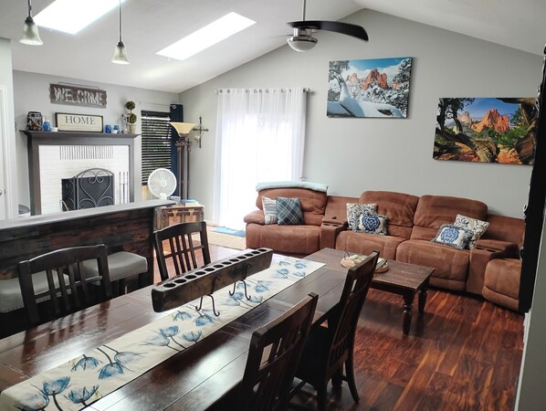 We hebben een 47 "muur gemonteerde televisie, open haard en liggende sectionele die 4 volwassenen comfortabel in de woonkamer uit de eetkamer naast de keuken biedt. Er zijn 3 uitnodigende slaapkamers en een complete badkamer op de begane grond. De slaapkamer heeft een kingsize bed, een inloopkast en een 50-inch muur-tv. De andere 2 kamers op de begane grond hebben elk een queensize bed.