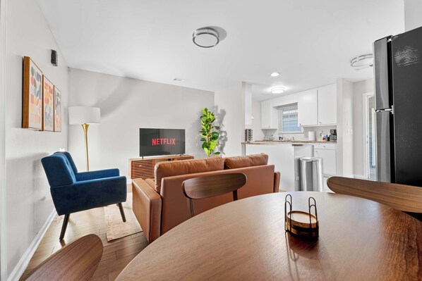 - Entertainment: Unwind with your favorite shows on the large Smart TV featuring a sleek, mid-century modern media console.