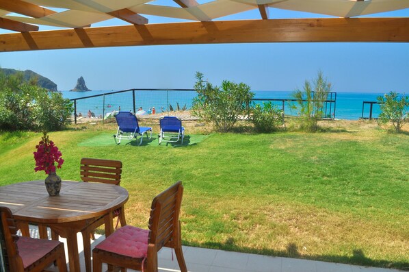 Groot aardterras met tafel en stoelen. Terras met barbecue. Directe toegang tot het strand.