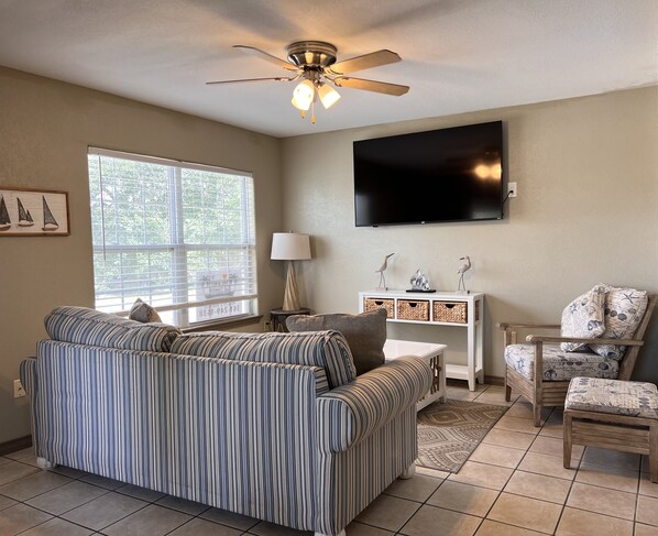 Outside, you'll find a large patio for enjoying the gulf breezes and a fenced SHARED yard that is shared by the complex for your four-legged friends to use. We've just added a shared breezeway for the complex with covered seating and a game area. It's a perfect place to unwind after a day at the beach.