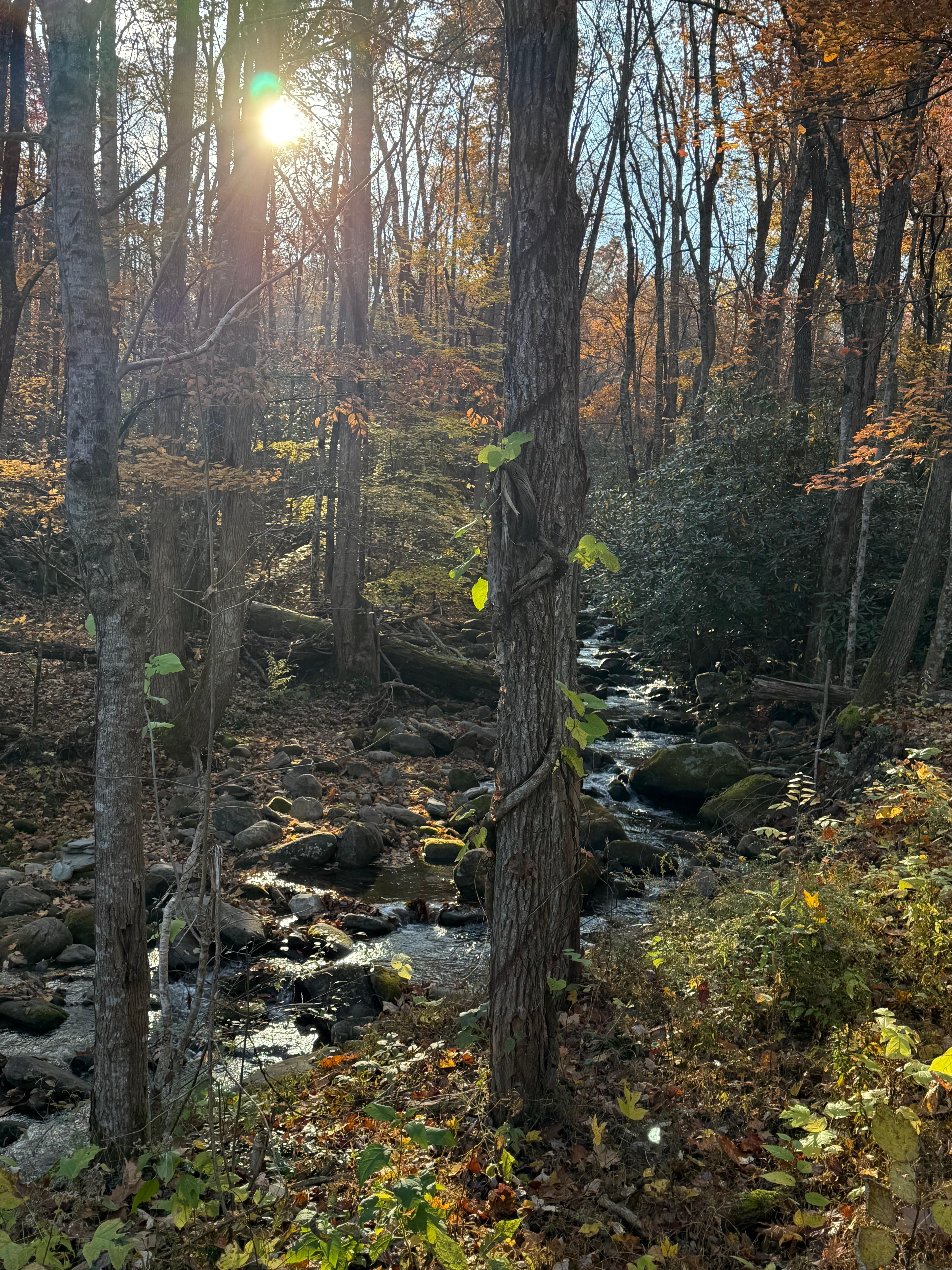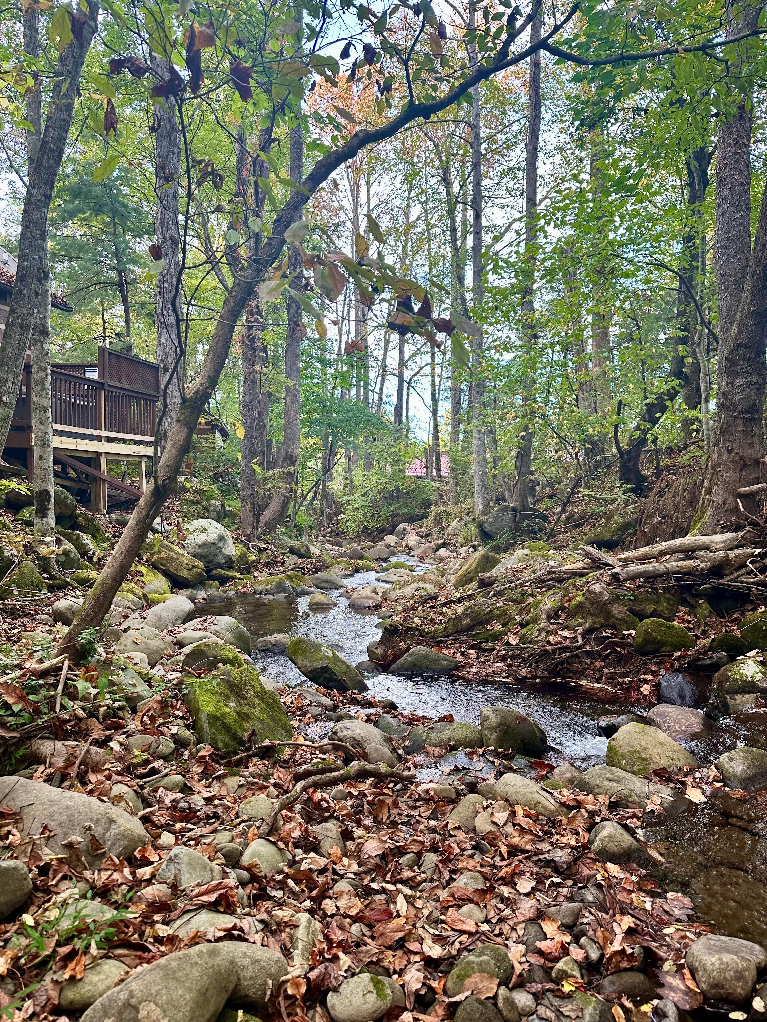 The back deck includes relaxing rolling creek views and sounds to enjoy while sitting in the cozy hot tub; perfect for relaxing and unwinding after a long day. Or perhaps you'd rather rock on the front porch and enjoy the beautiful wooded setting. Wine Down is set back further in woods, surrounded by only sights & sounds of nature for your escape vacation. A newly added fire pit just added for the cooler weather evenings to enjoy.