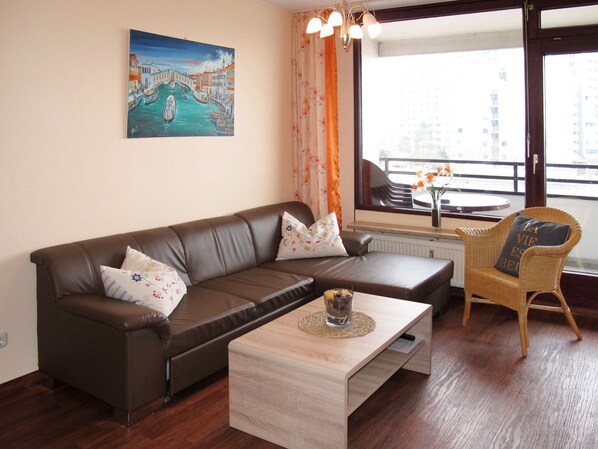 "Ostsee-Residenz (DMP161)", appartement 3-kamers 60 m2 op de 3e verdieping. Gezellig ingericht: woon-/slaapkamer met 1 2-pers divanbed, eettafel, Sat-TV en stereo-installatie. Uitgang naar het balkon. 1 kamer met 1 2-pers bed (140 cm, lengte 200 cm). 1 kamer met 1 2-pers bed (160 cm, lengte 200 cm). Open keuken (4-pits kookplaat, oven, broodrooster, waterkoker, magnetron, elektrische koffiemachine). Douche/WC. Balkonmeubilair. Uitzicht op zee en de haven. Ter beschikking: wasmachine, kinderstoel, kinderbed. Maximaal 1 huisdier/hond toegestaan. Rookmelders.