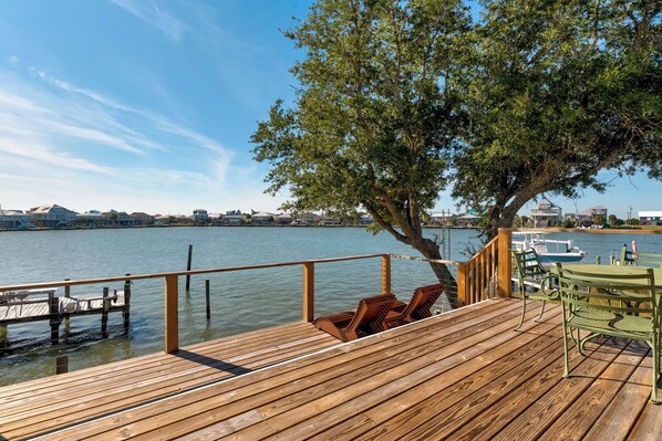 Great waterfront home on beautiful Lafitte Bay! Nestled among the oak trees this west end waterfront home is one of a kind. Lewis Landing II sleeps 12 with a maximum of 10 adults. No pets.