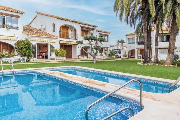 Gasten kunnen genieten van een uitzicht op het Montgo Nationaal Park vanaf de woning. Het vakantiehuis beschikt over een eigen buitenruimte met een open terras. De woning heeft toegang tot een gedeelde buitenruimte met een zwembad, een tuin en tuinmeubilair.