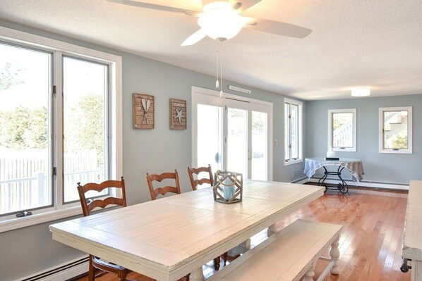 # 910 Verborgen schat: nieuw ingericht en bijgewerkt, op minder dan 400 meter van het strand, hondvriendelijk! Ons onlangs bijgewerkte en nieuw ingerichte vakantiehuis, gelegen in een rustige wijk aan de kust van Dennis Port, is de perfecte plek om te verblijven als u de volledige Cape-ervaring wilt. Lopen minder dan 400 meter verderop in de straat naar Raycroft Beach, waar u zult genieten van een prachtig uitzicht en mooi zacht zand. Op loopafstand bevindt zich ook het populaire restaurant The Ocean House aan het water, dat bekroonde gerechten met uitzicht op Nantucket Sound biedt. Pak een lekker ijsje op die warme zomerdagen bij Sundae School Ice Cream, ontbijt bij Wee Packet of bezoek de plaatselijke waterput Wooden Shoe; allemaal op slechts een korte loopafstand. In ons huis, vindt u op de eerste verdieping een bijgewerkte en volledig uitgeruste keuken met zitplaatsen op het eiland, zes zitplaatsen open eethoek die leidt naar de woonkamer met een grote gemonteerde flatscreen-tv en sofa-zithoek, een andere kleine woonkamer met een gemonteerde tv en een complete badkamer. De drie slaapkamers bevinden zich op de bovenverdieping, twee hebben queensize bedden en de derde heeft twee aparte bedden, evenals een complete badkamer gelegen tussen de slaapkamers met de queensize bedden. Een kleine privétuin en drie seizoen serre zijn ook kenmerken van ons eigendom. Andere voorzieningen zijn WiFi, kabel-tv / Smart TV, raam A / C-eenheden in de slaapkamers, wasmachine / droger op de eerste verdieping, buitendouche, gasgrill, en fris beddengoed en handdoeken verstrekt zonder extra kosten.