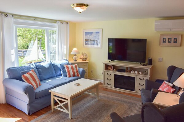 Welcoming, and clean home with mini split ac's in the living room/sun room. Walk to nice sandy beach! 2 bedrooms located on main level (each with window ac), and an additional large bedroom located upstairs (portable ac unit). Tastefully decorated living area with updated kitchen. Additional amenities include washer and dryer (located in shed) Lovely yard with deck, gas grill and enclosed outdoor shower. Only 3/10 of a mile to Glendon Road Beach.