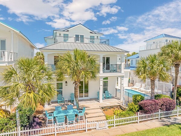 Geniet van een betoverend uitzicht op de Golf in dit huis met 6 slaapkamers en 6 badkamers, direct aan de overkant van het suikerachtige witte zand en de turquoise wateren van de Golf van Mexico. Dit huis is fris ingericht met luxe begeleidingen en is gelegen in de felbegeerde Destin Neighborhood of Crystal Shores. Met drie master suites, twee queensize kamers, een grote kinderkamer met vier aparte bedden, die allemaal een eigen badkamer hebben - uw gezin zal aan het einde van de dag ontspannen in hun eigen persoonlijke retraites. Dit huis straalt charme uit met een witte houten schutting, een weelderig met palmen geaccentueerd landschap, luchtige balkons en een geactualiseerd rustig strand chic decor. Het huis heeft een eigen, verwarmd, zwembad met een mooi zonneterras om te zonnebaden voordat u een duik neemt en veel stoelen om te loungen. Een lagunevormig gemeenschappelijk zwembad ligt op minder dan drie minuten afstand, dus je hebt meerdere opties voor waterige verfrissing.