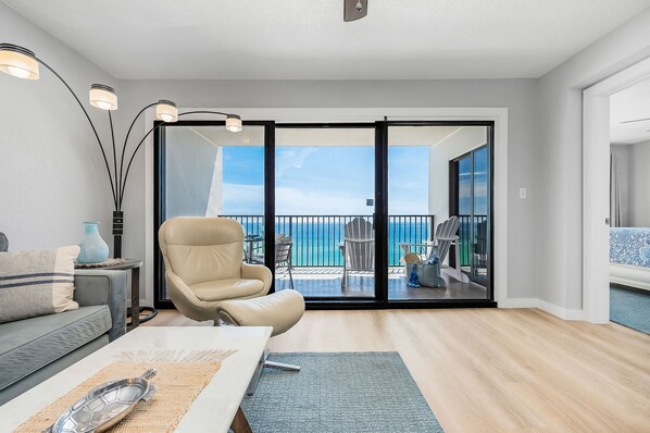 RIGHT ON THE BEACH - BEACH FRONT - Staande in de master suite kijken naar dolfijnen in de branding hieronder is een geweldige ervaring. De 9e verdieping creëert de perfecte uitvalsbasis voor een spectaculair uitzicht. Granieten aanrechtbladen en nieuwe roestvrijstalen apparaten maken tijd doorgebracht in de volledig uitgeruste keuken een aangenamere ervaring. Giet een glas wijn of mix een cocktail in de afzonderlijke drank bar met ijsmachine te genieten terwijl ontspannen op het balkon. In de flat, de leefruimte combineert modern comfort naar een ruime te maken, uitnodigende thuis weg van huis. Geniet van een 42-inch flatscreen-tv, compleet met iPhone-compatibele stereo, dvd-speler, HBO en compatibel met Netflix. Het appartement heeft een speciale, veilige, snelle WI-FI-service die niet wordt gedeeld met andere eenheden. De eettafel voor 6 personen comfortabel en er is extra zitplaatsen aan de bar. De master suite biedt een nieuw, luxe kingsize bed en een 32-inch flatscreen-tv, evenals toegang tot het balkon aan de Gulf Front. De 2e slaapkamer heeft ook een kingsize bed met nieuwe matras en een 32-inch flatscreen-tv met kabel en dvd-speler. Ons appartement beschikken over een eigen wasmachine en droger, grote bijkeuken en opbergkast.