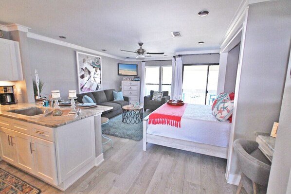 Step inside to discover a cozy yet modern space, thoughtfully designed to make you feel right at home. The studio features a fully equipped kitchen, stylish decor, comfortable bedding, and a cozy sofa sleeper with memory foam mattress.