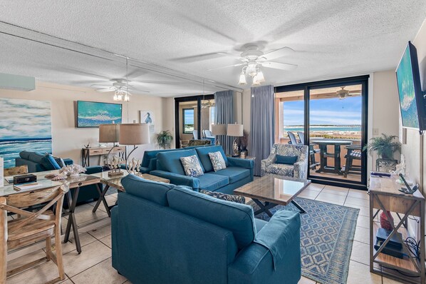 4e verdieping, GROTE EEN SLAAPKAMER, EEN EN EEN HALVE BADEN, UITZICHT OP ZOWEL DE GOLF EN DE PIERCE en een stoel bij het begin van de wekelijkse vuurwerkshow tijdens de zomer!