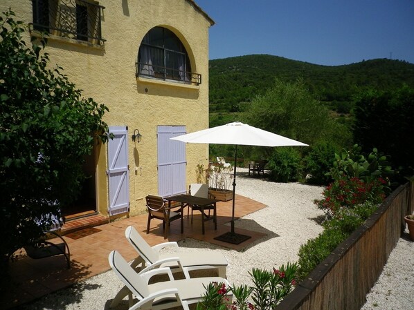 Naast het zwembad is een knus balkonterrasje met tafel en stoelen, waarvan u uitzicht heeft over de heuvels en de naast gelegen 'jeu de boules baan' met zithoekje en zonneterras. Er is altijd wel een rustig plekje in de zon of schaduw te vinden.