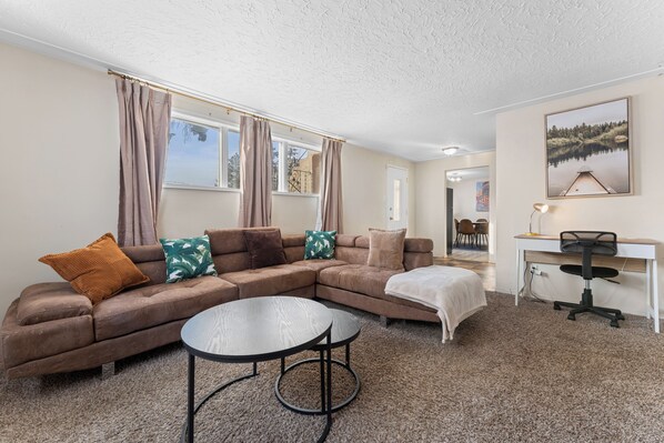 Living & Work Space After a day of exploring, unwind in the inviting living room on the large, comfortable brown sectional sofa. It's the perfect spot for a movie night. For those mixing work with pleasure, a dedicated workspace is also available for your convenience.