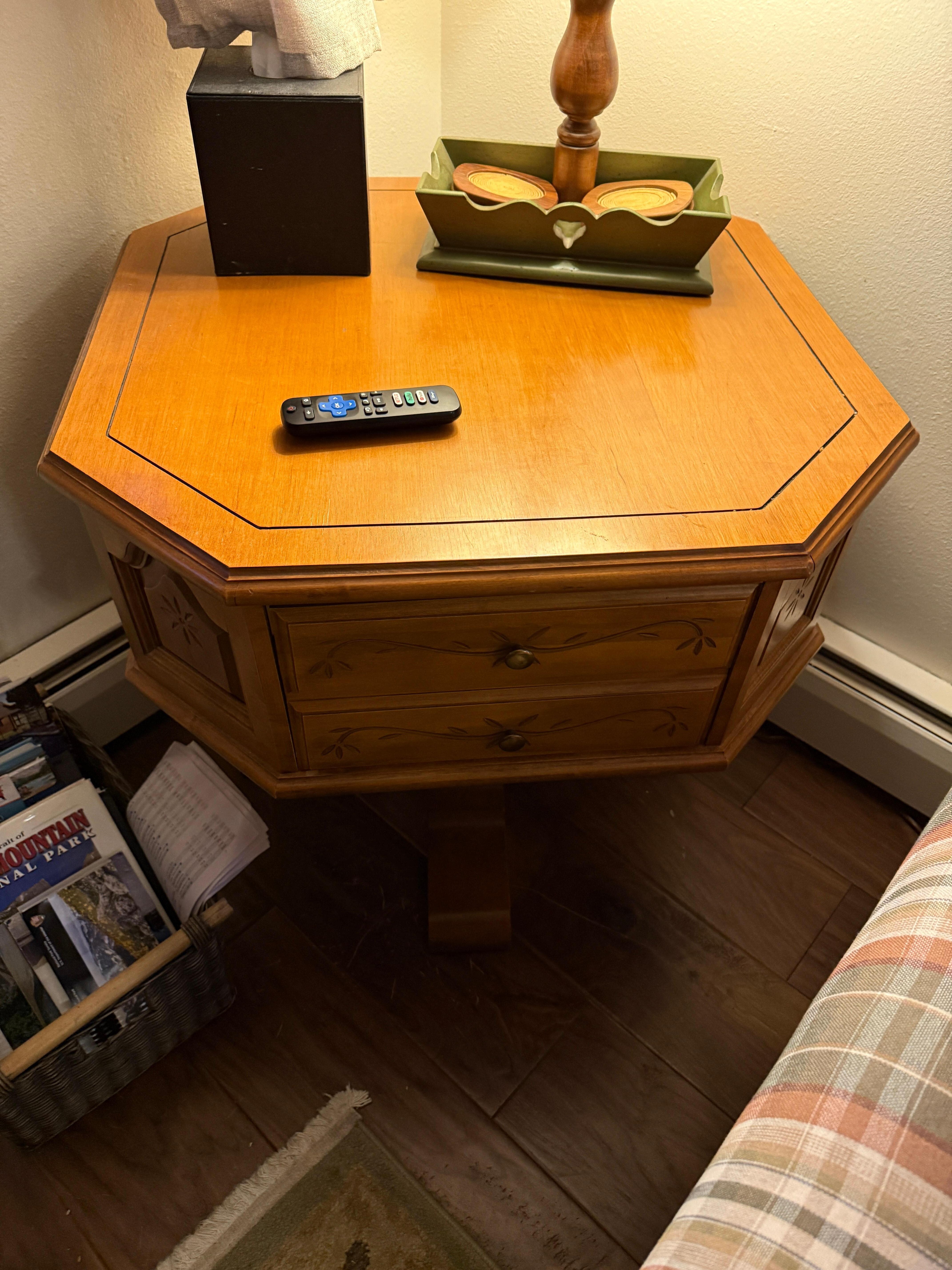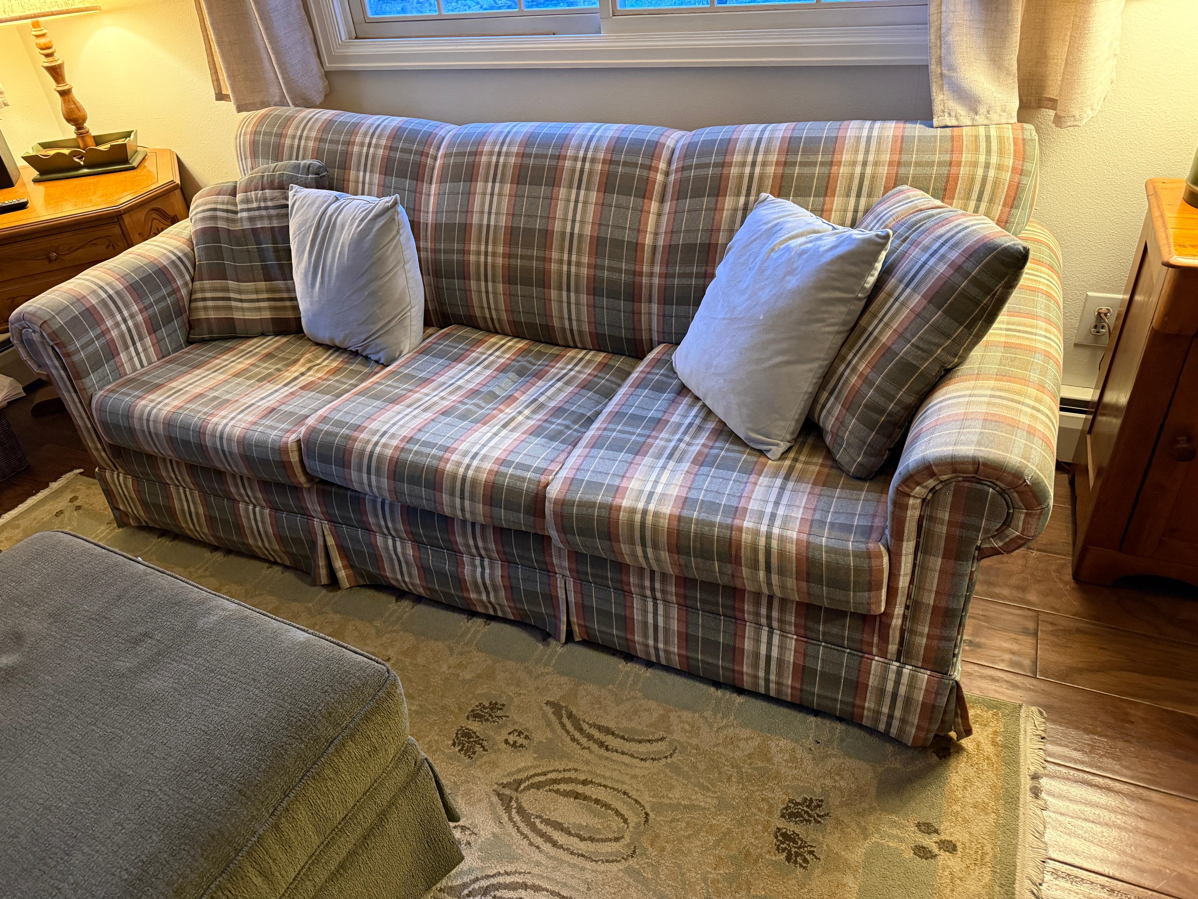 LIVING AREA: The living room has a couch and and an armchair. The gas fireplace stove is in a corner. There are books to read and two huge windows that look out over Fall River. There is a small dining table and chairs and a Roku TV with many channels (guests need to use their own login to access these).