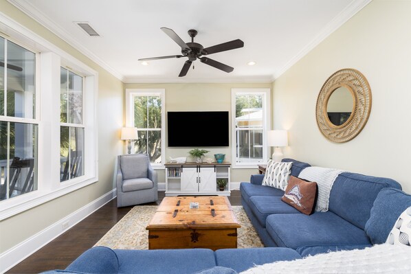 "Moore to Life" is een perfecte pasvorm voor vakantiegangers die behoefte hebben aan een modern en ruim strandhuis. Dit huis ligt in het hart van Folly Beach; een korte wandeling naar alle lokale winkels en restaurants. Een pad dat leidt van de achtertuin naar een lokale toegang tot het strand zorgt voor een mooie korte weg naar de oceaan. De begane grond van het huis heeft een zeer gastvrije en open plattegrond met walnoot hardhouten vloeren en beschikt over een volledig uitgeruste keuken met granieten aanrechtbladen en roestvrij apparaten. De woonkamer biedt plaats aan de hele groep voor games, conversatie of films kijken op de flatscreen-tv. De ruime slaapkamer bevindt zich op de begane grond en heeft een kingsize bed met designlinnen, een volledig betegeld hoofdbad met een apart toilet, dubbele wastafel, een betegelde regenwaterdouche en een apart tuinkuipje. Er is een grote veranda aan de voor- en zijkant die bezoekers uitnodigt om te ontspannen in een van de hardhouten tuimelaars, naar de branding van de oceaan te luisteren en de prachtige wind te voelen. De tweede verdieping van het huis heeft een groot loftgedeelte, perfect voor kinderen en tieners met een aan de muur gemonteerde flatscreen-tv en een slaapbank. Er is ook een kinderspelkast, perfect voor de kleintjes. De tweede slaapkamer heeft een queensize bed en deelt een 'Jack and Jill'-bad met de derde slaapkamer. De koningin slaapkamer heeft een aparte bonus kamer met twee aparte bedden die ideaal is voor baby dutjes, of tieners die graag laat slapen. De derde slaapkamer heeft twee stapelbedden - een met een tweepersoonsmatras op de bodem die geschikt is voor mama, papa en drie kinderen. Alle slaapkamers hebben ruime kasten. De parkeerplaats onder het huis heeft ruimte voor vier grote voertuigen en is ook een perfecte plek voor de kleintjes om te spelen tijdens de occasionele regenachtige dag. Het strand is ideaal om te surfen, zwemmen, vissen of gewoon te wandelen en zeeschelpen te verzamelen. Het is een korte wandeling langs het aangrenzende gemeenschapspad en door een bebost terrein.