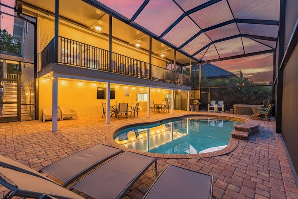 Achter het huis is een gloednieuw zwembad met kooien dat uitkijkt op het Mantanzas Pass-domein en dat veel privacy biedt.