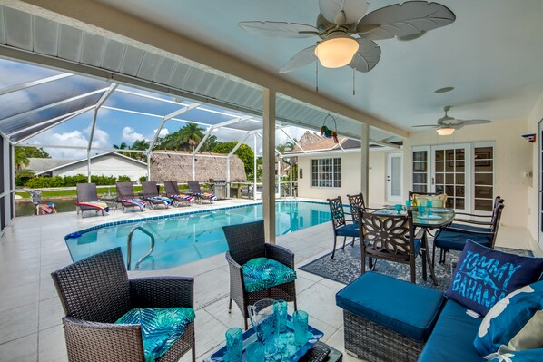 Begin uw dag met koffie op de privéporch met rieten tiki-afdekking net buiten een van de 4 slaapkamers. Ga dan naar het zwembad / Lanai-gebied om te zonnebaden, te lezen en de e-mail in te halen met ons snelle internet. Of loop naar het grote dok en neem de kajaks voor een zachte rit door de grachten. Direct aan het water is er ook nog een grote tiki-hut met comfortabele zitplaatsen waar u kunt ontspannen of vissen.