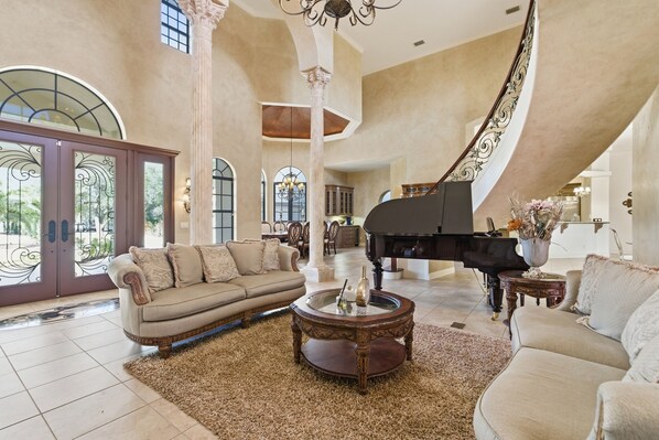 Outdoors, unwind in your private pool, stroll along the serene pond, or enjoy evening conversations under the gazebo, surrounded by tranquil countryside views. Inside, entertainment is endless—from the grand concert piano to the billiard table, and a dedicated Monopoly table with an upstairs dry bar designed for late-night fun and connection. Movie lovers will appreciate the private home theater, perfect for immersive film nights.