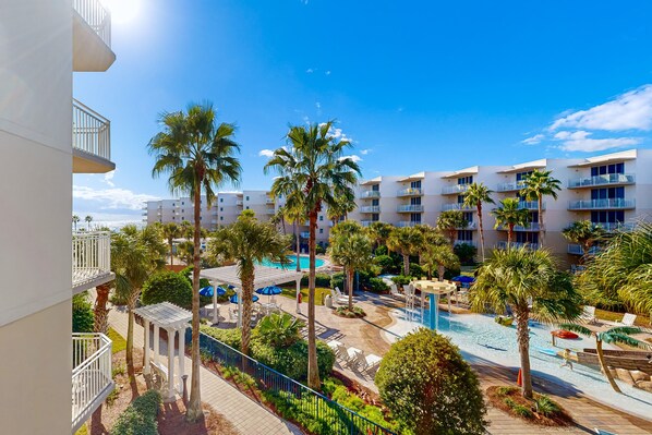 Waterscape A422 is a gorgeously decorated, condo boasting lovely views of the property's pool area and stunning peaks of the Gulf waters. This spacious condo accommodates up to six guests comfortably, with a king bed in the bedroom, a queen sofa bed in the living area, along with a twin bunk bed nestled in the separate bunk area, ideal for children. Upon entering, you will find a short hallway on your left, leading to the bunk area as well as a guest bathroom, complete with a single vanity as well as a spacious walk-in shower. There is also a stackable washer/dryer combination in the hall area as well, allowing you and your loved ones to pack lightly and leave plenty of room for souvenirs. You will find the well-equipped kitchen immediately on your right, boasting gorgeous granite countertops and stainless steel appliances, along with plenty of storage space and all utensils, appliances, and cookware to create your favorite meals while on vacation. The kitchen opens into the dining area and living room, allowing for plenty of room to spread out. The large dining table provides the perfect seating arrangement for a family meal. Step into the inviting living area, boasting beautiful matching furnishings and décor, along with a large TV and DVD player. Relax and unwind in the evening with a family movie night, after a long day of soaking up the sun on the beach or exploring all that Okaloosa Island has to offer.