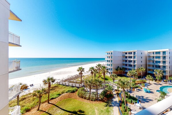 This condo has a breathtaking view of the Gulf of Mexico and the Tropical Gardens and Pools. Unit A502 has an open floor plan that leads to a private spacious balcony with outdoor furniture. this home is beautifully decorated in peaceful blues and earthy brown tones and is accentuated with wonderful artwork. The condo's kitchen is well appointed with granite countertops, stainless steel appliances, and beautifully tiled floors. All dishes, cooking utensils, and bake ware are provided to complete and serve meals. The dining area has a large table with seating, and the bar area has two stools for additional seating. This condo offers a unique twin bunk area for extra accommodations. The open living room houses a queen sofa bed, TV, and DVD player. There is a half bathroom located off of the main living area near the bunk room. The primary bedroom features a king bed, bath with stand up shower and garden tub, TV, and DVD player. The second bedroom includes a queen bed, bath with stand up shower and garden tub, TV, and DVD player.