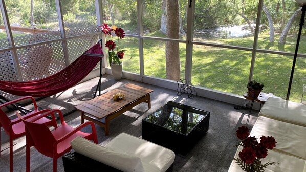Come to Fairy Stream’s house to enjoy the sound of a beautiful long running river in the backyard with beach area, and to admire wonderful surrounding mountains while relaxing on a large deck with a Screened Room (Tea room) on the side overlooking the river stream, and viewing the beautiful Oaks and Sycamore trees that provide shady areas over the green grass back yard.