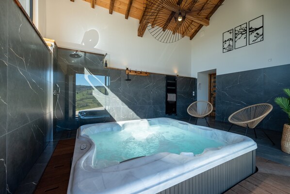 Buiten ontspannen jullie in de privétuin of op een van de twee terrassen met prachtig uitzicht op bergen en bossen. Er is een jeu-de-boulesbaan en een barbecue voor gezellige maaltijden in de open lucht.