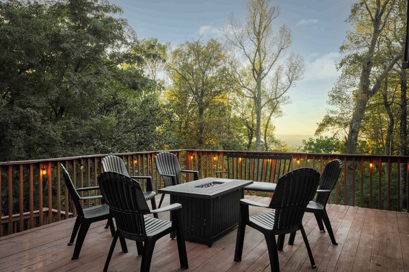 Step outside to experience the calm rhythm of the mountains. The wide wraparound deck includes multiple picnic tables, a gas grill, and peaceful views of the surrounding woods. Guests can relax in the private HotSpring spa, enjoy dinner outdoors, or gather around the propane fire table as the evening cools. The deck is a favorite spot in every season—from morning coffee among the trees to quiet stargazing once night settles over the ridge.