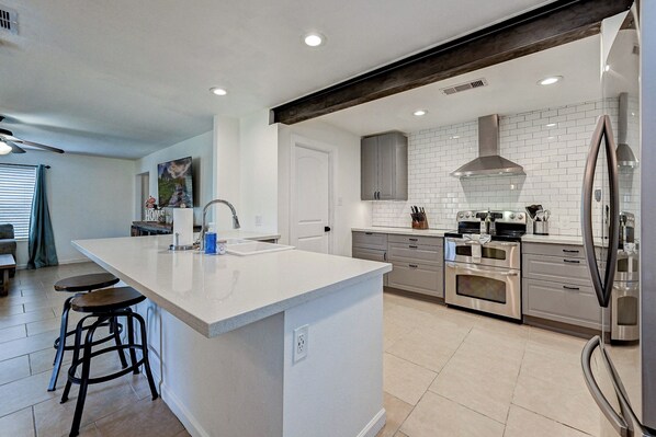 A sizable, well-stocked kitchen makes this the perfect space for groups that like to cook together. Fully equipped with glasses, mugs, plates, bowls & silverware for 13. Coffee/Tea Bar includes Keurig, drip coffee maker, and electric kettle. Blender, toaster, and microwave included. Gas stovetop range + oven. Pots/pans, baking sheet, oil, salt & pepper.