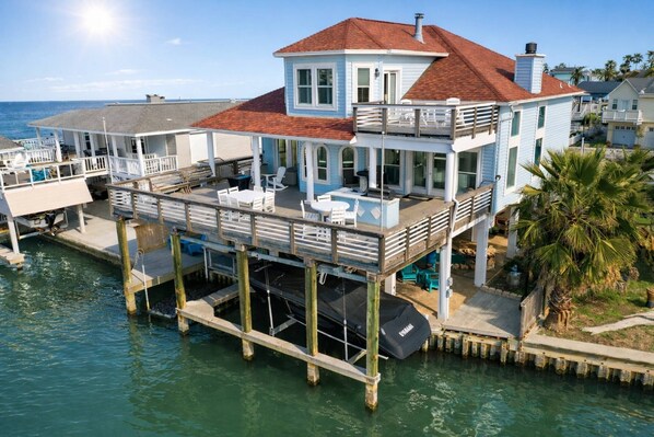 Lounge in the shade or sunbathe on the upper deck offering panoramic bay views. An impressive outdoor kitchen includes a grill, cooktop, and mini-fridge. This rental is equipped with a washer/dryer and complimentary WiFi. Fishing from the deck is welcomed! Arrange kayak rentals and paddle down the canal to West Bay, where open water awaits. A short drive will bring you to Galveston Island State Park where you can explore 2,000 acres of hiking trails and swimming areas.