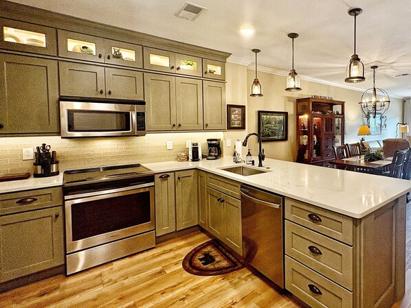 De volledig ingerichte keuken beschikt over een side-by-side koelkast uitgerust met water en ijs in de deur, vaatwasser, oven met gladde top bereik, en een ingebouwde magnetron. De keuken beschikt ook over een Mr. Koffie en Keurig koffiezetapparaat, broodrooster, blender, crock pot en een vuilophaal.