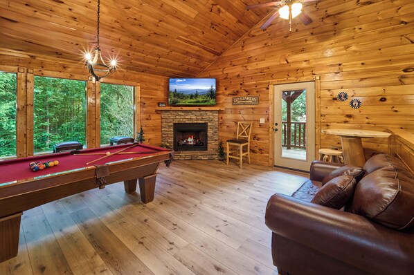 Ontspan in uw eigen bubbelbad op de overdekte veranda op het lagere niveau. Met zoveel dingen om te doen, wil je misschien niet weggaan. Kook in huttenmaaltijden in uw complete keuken en geniet van het gemak van een gasgrill net buiten de eetzaal. Eet buiten op het overdekte terras met een beschutte veranda of dineer binnen op de op maat gemaakte cederhouten stamtafel met banken.