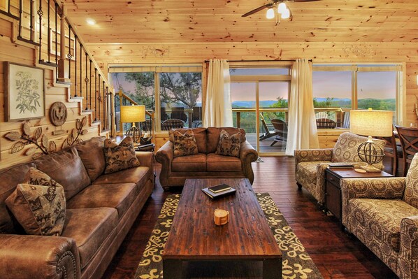 Als je de cabine in te voeren, wordt u gefascineerd door prachtige ramen met u miljoen dollar uitzicht. Als je de hoek om, onze prachtige vloer tot plafond gas open haard is het centrale punt voor de begane grond onderhoudende gebied.