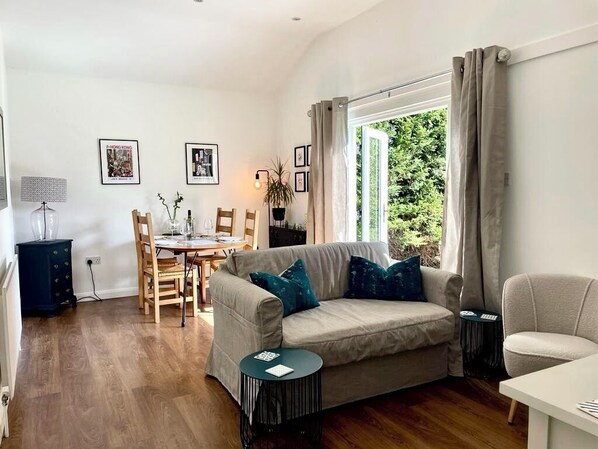 Recently refurbished, it has a fully fitted kitchen, lounge with smart TV, high-speed wifi, and a patio overlooking the (shared) lawn. Behind the lawn is a field where you may see rabbits, foxes, deer, and our resident buzzards.