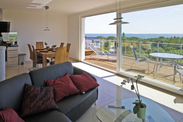 Penthouse 5: Het penthouse 5 van de "Villa Ostseeblick" is 85 m² en uitgerust met vloerverwarming voor 4 personen. De woonruimte van 30 m² is royaal ingericht en ontworpen met roze Portogallo marmeren fijne steen. Grote schuifdeuren openen de raamfronten naar het 42 m² grote balkon, naar het zuiden met uitzicht op de Oostzee en naar het westen met uitzicht op de baai en de Zicker-bergen. Een overhangend plat dak en een luifel beschermen tegen overmatig zonlicht en 's avonds nodigt een houtkachel uit tot idyllische uren. Een zitgroep in zwart leer is uitgelijnd met een uitzicht op de Oostzee. Het LOEWE 42 "100 Hz flatscreen voor" digitale Full HD "-TV met DVD / BluRay-speler heeft ook digitale en internetradio en is zeer eenvoudig te bedienen met slechts één afstandsbediening. Dit maakt van uw nieuwe huis een echte vakantiebelevenis. Een ruime eethoek gemaakt van hoogwaardig kersenhout en de open keuken, die is uitgerust met een aanrecht graniet, keramische kookplaat, oven, magnetron, vaatwasser, koffiezetapparaat, waterkoker en broodrooster eerste klasse, maak het welzijn in ons penthouse appartement compleet. Het penthouse 5 heeft twee slaapkamers met originele comfortabele boxspringbedden voor orthopedisch correct liegen en gezond slapen met verschillende hardheidsgraden. Om in slaap te vallen, kunt u een rustgevend en ontspannend kleurenlicht kiezen, of u maakt de slaapkamer volledig vrij van spanning. Voor ontspannende uren na een drukke dag is er ook een tv in de slaapkamer. Als je zin hebt om buiten te slapen, open dan gewoon de schuifdeur naar het westelijke deel van het balkon rondom. Dan kunt u zelfs de zonsondergang ervaren met het oog op de baai. Op verzoek biedt een van de slaapkamers zelfs een spectaculair uitzicht op de Oostzee. Twee badkamers, één met bad, de andere met een douche op de grond garanderen het ultieme zwemplezier - zelfs met zachte muziek of het laatste nieuws. Beide badkamers zijn comfortabel uitgerust met een toilet, een badmeubel en een spiegelkast met make-upspiegel en haardroger. Begrijp alsjeblieft dat roken niet is toegestaan in het huis en de appartementen.