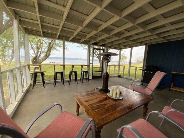 On the lake side of the house is a screened in patio complete with a gas grill. Grill utensils are available. There is a built in eating bar facing the lake so you can enjoy the view. There is plenty of yard for the kids to enjoy and an outdoor shower to rinse off with easy access to the bathroom through the side door.