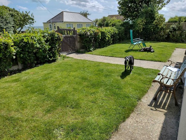 De tuin is volledig omheind met 3 voet 6 hoge hekken aan de voor- en achterzijde en 6 voet hekken aan de zijkanten, veilige afsluitende poorten en een oprit voor een auto. Extra auto's kunnen op de weg worden geparkeerd. De tuin is voornamelijk aangelegd met gazon, het is goed onderhouden, we hebben een zonnewijzerpatio met tafel / stoelen / parasol / BBQ en comfortabele ligstoelen worden opgeborgen in een buitencontainer. Er is een buiten wasgebouw met wasmachine en droger.