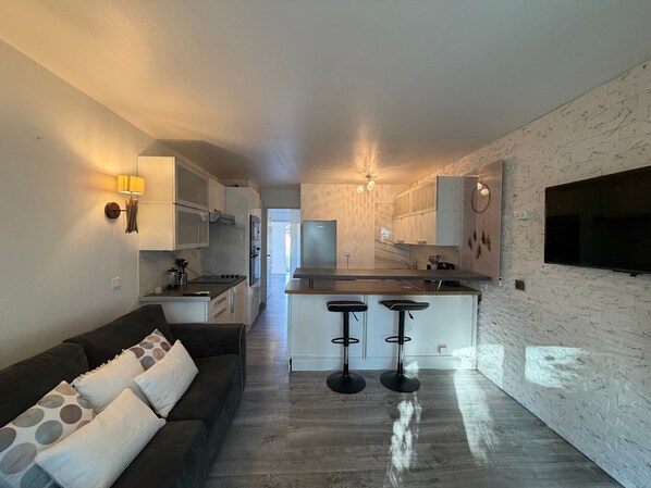 Gelegen op de eerste en bovenste verdieping (geen lift), met volledig uitgeruste keuken, woonkamer met slaapbank voor 2 personen, veranda en tuin.