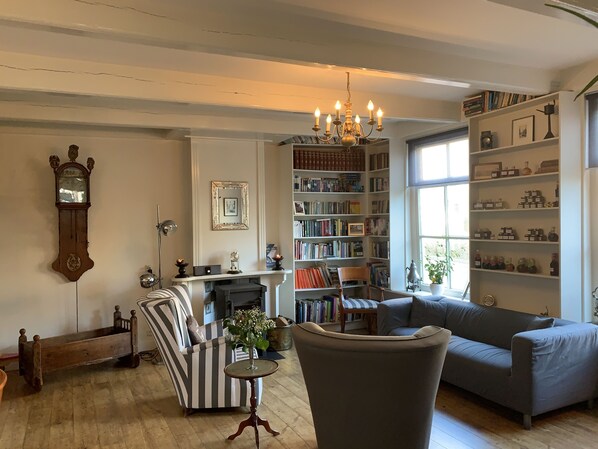 De Thuiskamer is een gezellige en sfeervolle woning, voorzien van alle hedendaagse gemakken en luxe en uiteraard gratis Wi-Fi. De beneden verdieping is voorzien van een grote eettafel, waar u met zijn allen aan kunt zitten voor het ontbijt, diner, spelletjes en nog veel meer. De houtkachel zorgt in de wat koudere maanden voor extra heerlijke warmte en met een boek uit de bibliotheek kunt u hier ultiem tot rust komen.De ruime keuken is van alle luxe en gemakken voorzien, zoals vaatwasser, magnetron, oven, steamer, Nespresso, waterkoker, wasmachine en nog veel meer.