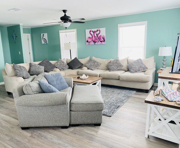 Ontspan in de woonkamer op de sectionele bank & extra grote stoel met plaats voor acht. Bekijk een film op de 40-inch flatscreen-tv met HD-kabel of geniet gewoon van quality time met uw gezin. De extra grote stoel in de woonkamer klapt ook uit in een slaper.