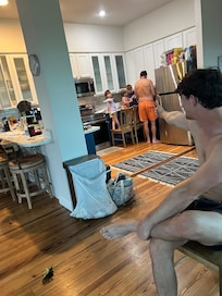 Our entire family truly enjoyed Dolphin East. There was something for everyone! It met all our needs: plenty of rooms, views from multiple levels, the ocean right out the back door, place for wee ones to play down stairs, room to spread out, big table for family dining and game nights, well stocked kitchen for cooking, multiple fridges, even a place for you to get a little solitude away from the bustle of a big family. My personal favorite was the master with the porch. If you don’t feel like going out to the beach, you can sit up there and still enjoy all the best parts of it without the sand. It rained on us a couple of days, but that didn’t hinder us from having a good time because there’s enough room to keep kids and grownups busy if you can’t get outside. The neighborhood was friendly and felt very safe. We love being away from the busy beach activities, but still close enough to drive there. There were plenty of restaurant options within a few minutes drive and stores for those things we forgot. The beds were comfortable, the towels were wonderful, and there were enough bathrooms for all of us without having to wait on anyone to finish- that’s important with Littles. Our grown kids enjoyed the patio seating in the early mornings and evenings while the littles played on the screened-in back porch. The host was quick with responses also. Best family vacation to date! Thanks, Dolphin East!
