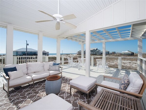 Er is 930 vierkante meter aan leefruimte buiten, waarvan sommige overdekt zijn, met uitzicht op de Golf en de baai. Een comfortabele buitenbank op de overdekte veranda aan de westkant van het huis maakt genieten van prachtige zonsondergangen een briesje. De buitenruimte heeft een pergola die geweldig is om buiten te entertainen.
