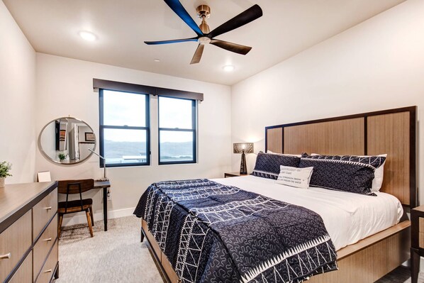 Step inside and be captivated by the all-new mountain modern design that seamlessly blends chic style with ultimate comfort. The primary bedroom is a sanctuary, featuring a king-size bed, an ensuite bathroom with a dual sink vanity, a glass and tile walk-in shower, and a spacious walk-in closet. From the primary bedroom, enjoy direct access to the outdoor deck, perfect for soaking in the breathtaking mountain and lake views. The second bedroom also offers a luxurious king-size bed, while the third bedroom is equipped with both a full and a queen bed, ideal for accommodating additional family members or friends. For even more flexibility, an additional queen air bed is available, ensuring that everyone has a comfortable place to sleep.