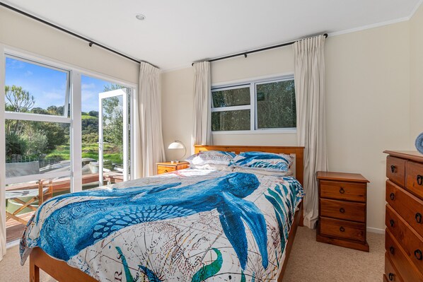 Summer evenings don’t get much better than this, enjoy being surrounded by Pōhutukawa and fruit trees out on the spacious deck. You’ll love nothing more after a day of exploring than to come home to an alfresco BBQ meal here, while your four-legged furry-friends play on the lush, flat lawn, as Teal Bay Treasure is pet friendly.