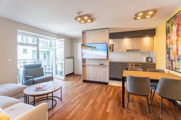Het vakantie appartement in de Villa Ahlbeck in luxe voorzieningen is geschikt voor maximaal vijf personen: * Rustig 3-slaapkamer appartement met balkon met uitzicht op het meer in de 2e Boven * Woonkamer met comfortabele zit- en eethoek en kitchenette * een slaapkamer met tweepersoonsbed, een slaapkamer met twee eenpersoonsbedden * Modern sanitair met douche en toilet en gastentoilet * Flatscreen-tv, radio / CD-speler en Wi-Fi * Complete keukenapparatuur van keramische kookplaat tot Magnetron * Sauna, stoombad en fitnessapparatuur en ontspanningsruimte * Speelzaal voor onze kleine gasten * Coin-wasmachine en droger * Parkeerplaats in de tuin direct bij het huis en opslag voor fietsen