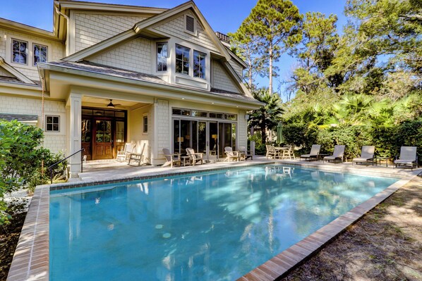 Deze Sea Pines-oase is ontworpen met het ontspannende eiland in het achterhoofd. Ontspan bij het grote zoutwaterzwembad of wikkel rond het terras met een eigen bubbelbad en luister naar de zeebries terwijl deze door de palmbomen ritselt. Deze 7 slaapkamers, 7. 5 badkamers, beschikt over een indeling op meerdere niveaus met overal op maat gemaakte architectonische details. Grote of zelfs meerdere gezinnen zullen zich hier thuis voelen met twee master suites en 4 extra ruime slaapkamers, allemaal compleet met designer badkamers. Wijd open woonruimtes en een keuken die iemand zal inspireren om een topchef te worden met zijn SubZero-koelkast, Viking-apparaten en massief keukeneiland. Perfect gelegen langs het strandpad op de vierde rij, op slechts een korte zanderige wandeling van de zee en op enkele minuten afstand van golf, tennis, South Beach en Harbour Town.