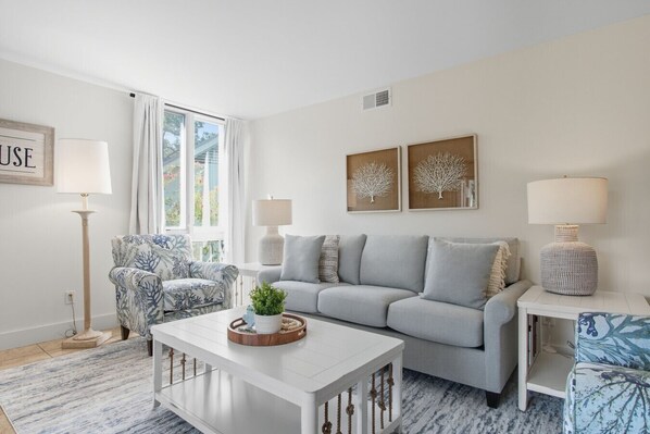The villa’s common spaces are just as inviting. Gather around the brand-new dining set for meals together, sink into the cozy new living room furniture for movie nights, or enjoy a little friendly competition at the new game table. Every bedroom has been updated with fresh carpeting, adding an extra layer of comfort after a day of beach walks or biking through Sea Pines.