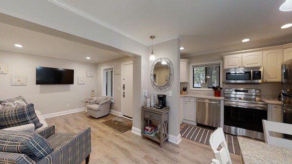 The living area has all new furnishings. New wall mounted 50" Smart TV with 64 cable channels. We also provide free secure wifi.