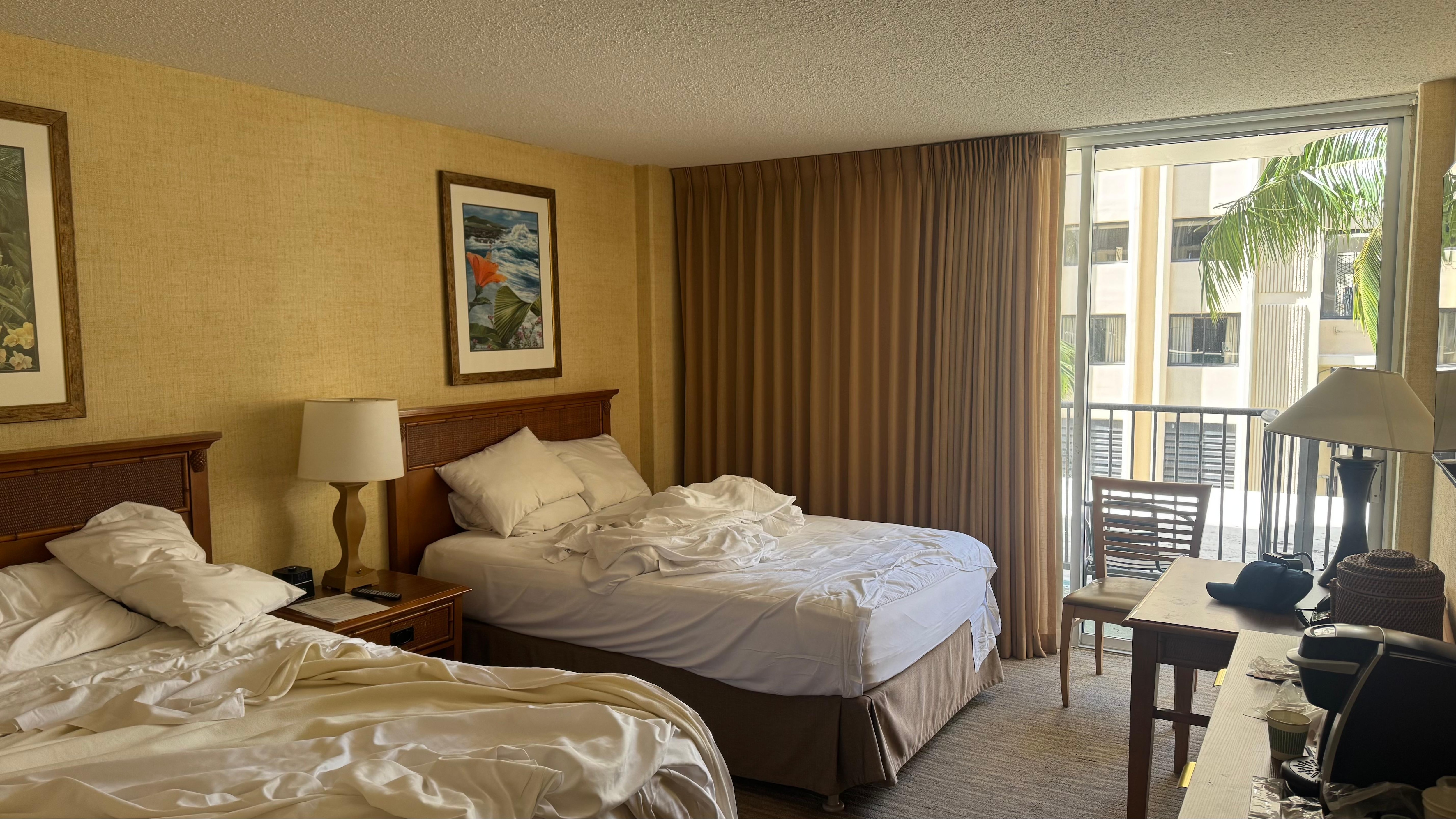 Staff cleaned the room wonderfully every day and accomodated our late mornings. The view, although not waterfront was still beautiful palm trees. The building itself is older and has visible damage. Bathroom was very small and water spilled all over the floor every time we showered. Cost was good and hotel was located very close to restaurants and Waikiki beach.
