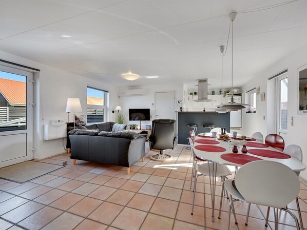 Dit vakantiehuis in Hvide Sande is voorzien van een keuken en een open haard